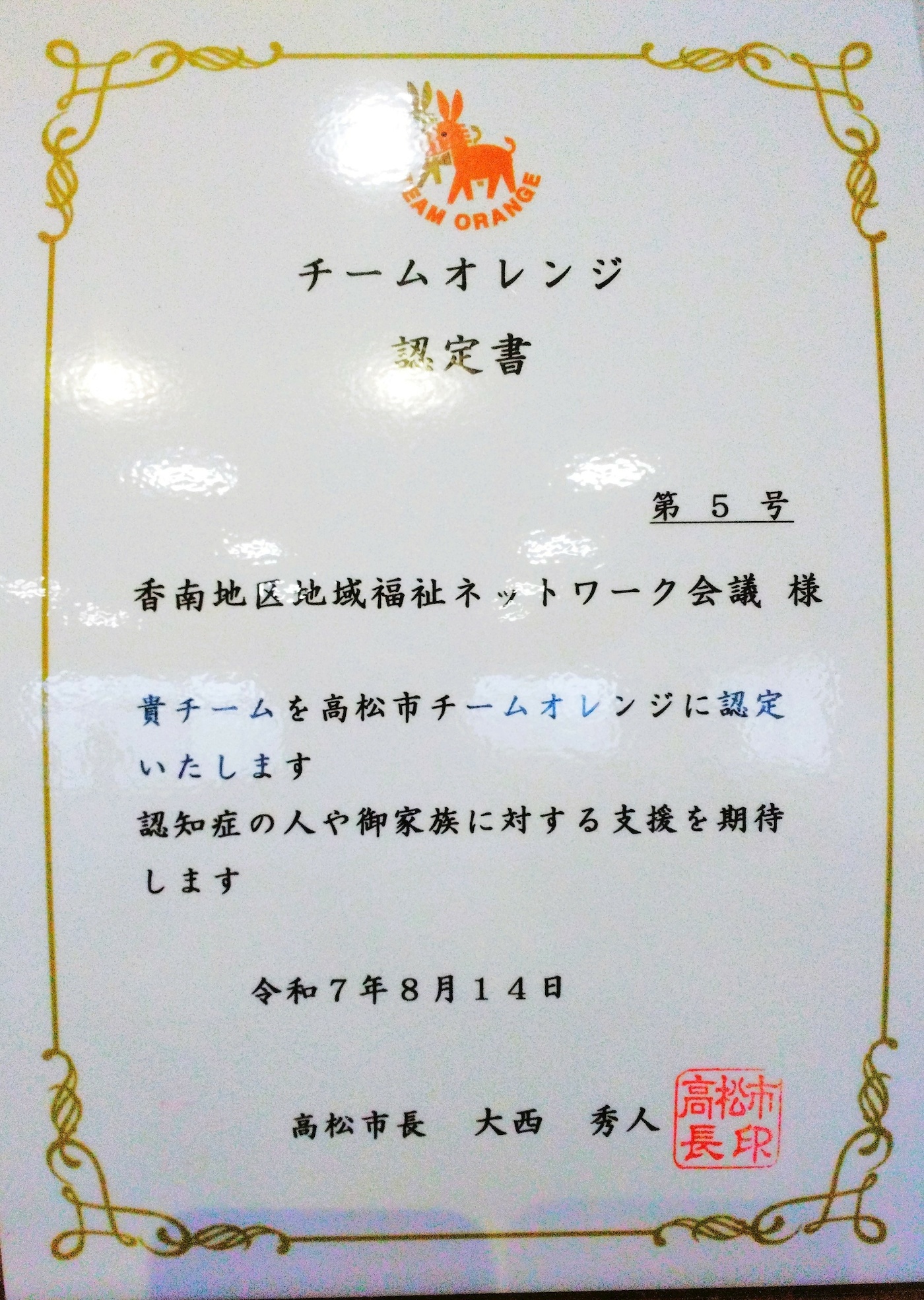 この度、「香南地区地域福祉ネットワーク会議」が第5号チームオレンジに認定され、令和7年11月25日に認定式がありました。