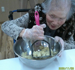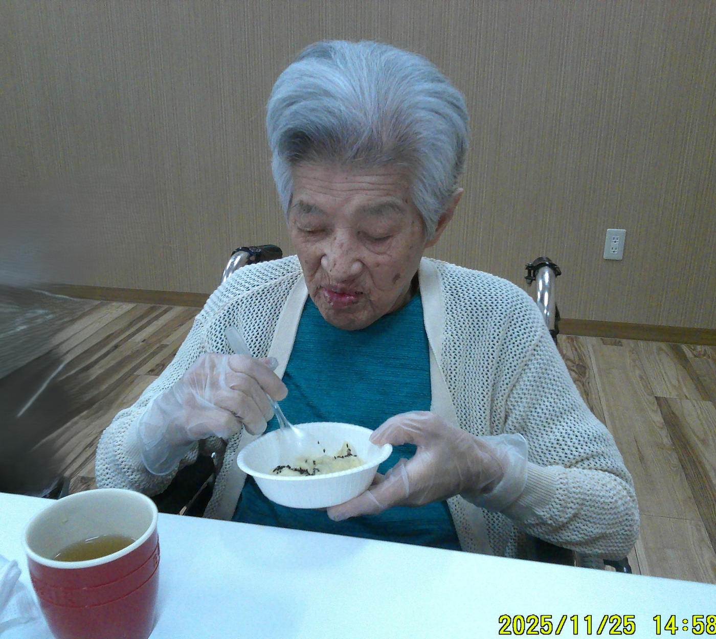 11月誕生会 2025年12月01日 11月の誕生会は、さつまいも茶巾づくりをしました。 さつまいもをすりつぶす時に「よいしょー!」と元気よく掛け声をあげたり、一口ずつ丸めるときは静かに真剣な様子で取り組まれたりと、各々おやつ作りを楽しまれていました。 みんなで食べた後は、11月誕生日の利用者様にプレゼントを渡し、歌を唄ってお祝いしました。 段々と冬が近づいていますが、しっかりとご飯を食べて乗り切りましょう!!