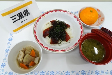 日本一周ご当地グルメ旅!第31回は三重県です!! 2025年12月15日 メニューは、手こね寿司、のっぺい、みかん、あおさのみそ汁です。 漁師が、船上でとれた魚をその場でさばいて、手で混ぜ合わせたことから「てこねずし」と呼ばれるようになったそうです。 魚は、カツオやマグロが使われます。今回は、マグロを使用しています☆彡 次回は、1月!徳島県へ!!お楽しみに♪