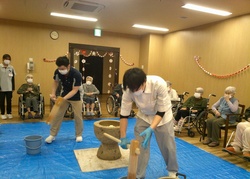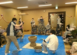 職員が餅をつくのに合わせて「よいしょー!」と大きな掛け声を出して下さいました。利用者の皆様に餅つきのことをお聞きすると「昔は、家でよくしよったんや。近所の方も交えてしていたので、1日中かかった」「40歳は若返ったわー」とおっしゃられて皆さん大変喜ばれました。