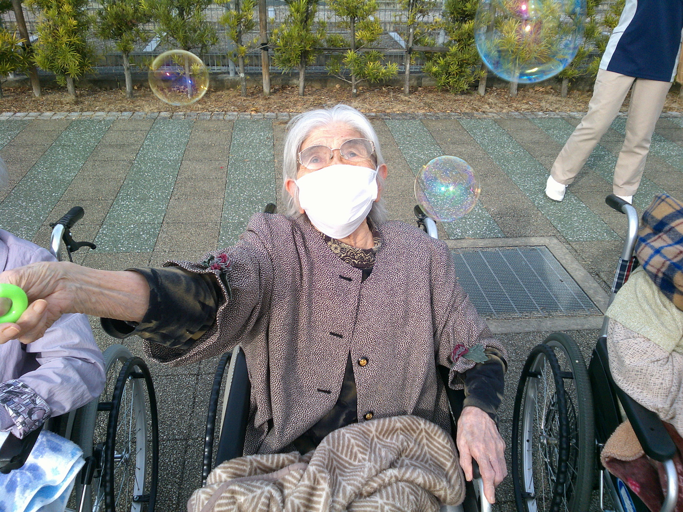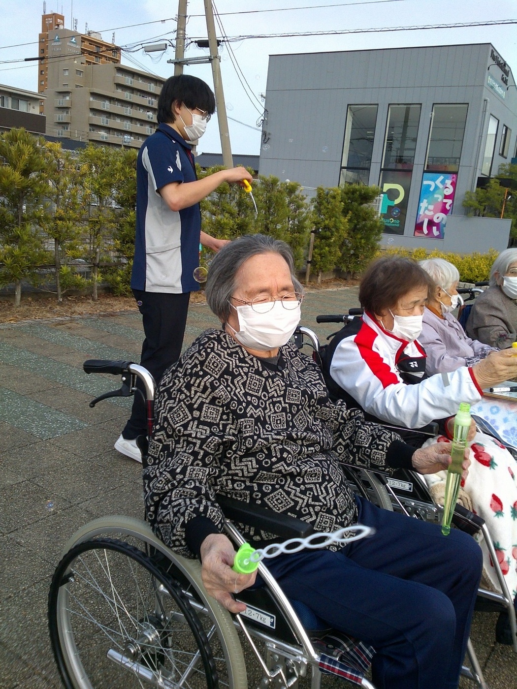 外気浴に行きました。 2025年11月09日 11月4日に外気浴レクとして、平塚中央公園に行きました。 公園では、シャボン玉を使用したレクリエーションを行いました。利用者や職員がシャボン玉を飛ばすと「懐かしいわぁ」「きれいやなぁ」とおっしゃられて、笑顔も多く見られました。出発前には、寒さを気にされていた利用者もいましたが、公園に着く頃には「思ったより暖かくていいなぁ」とおっしゃられて、秋晴れの気持ちのいい一日となりました。 Tweet