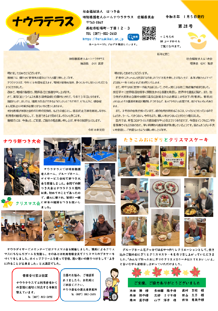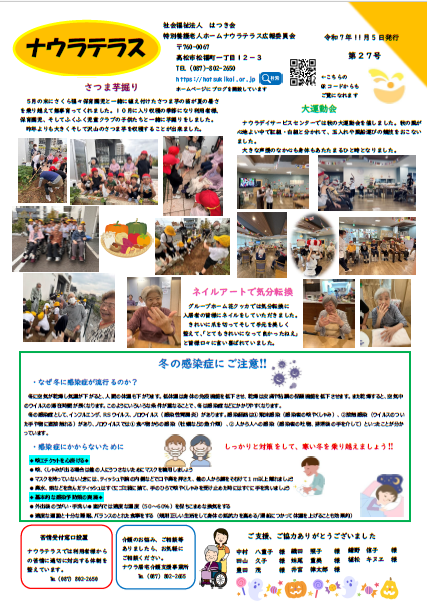 令和7年広報誌 令和7年 1月号 〇新年のあいさつ 〇介護王座決定戦出場 〇餅つき 〇クリスマス会 令和7年 3月号 〇ひなまつり 〇節分祭り 令和7年 5月号 〇お花見ドライブ 〇ネイルレクリエーション 〇ナウラ喫茶 令和7年 7月号 〇七夕レクリエーション 〇ナウラ菜園の収穫 〇熱中症対策について 令和7年 9月号 〇フルーツポンチ作り 〇すいか割り 〇夏の疲れを残さない生活習慣 令和7年11月号 〇さつま芋掘り(ナウラテラス) 〇大運動会(ナウラデイサービスセンター) 〇ネイルアートで気分転換(グループホーム花クッカ) 〇冬の感染症にご注意‼