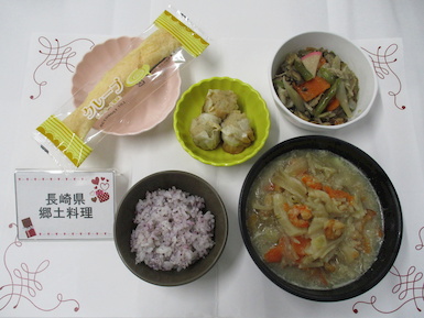 長崎県の郷土料理 2026年03月02日 ナウラテラスでは毎月1回郷土料理を取り入れています。 今年度11回目の郷土料理は長崎県の長崎ちゃんぽん、浦上そぼろです。 「長崎ちゃんぽん」は、中華鍋ひとつで作れる美味しく栄養たっぷりな麺料理で、長崎県で日常的に食される家庭料理となり、同時に多くの飲食店でも提供されはじめ全国で知られるようになりました。 皆さま、「美味しい」と笑顔で召し上がっていました♪ Tweet