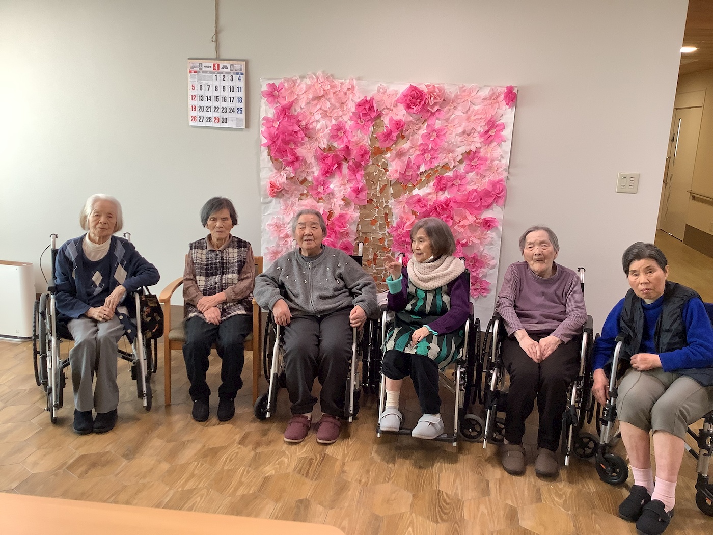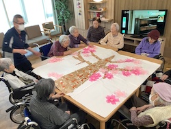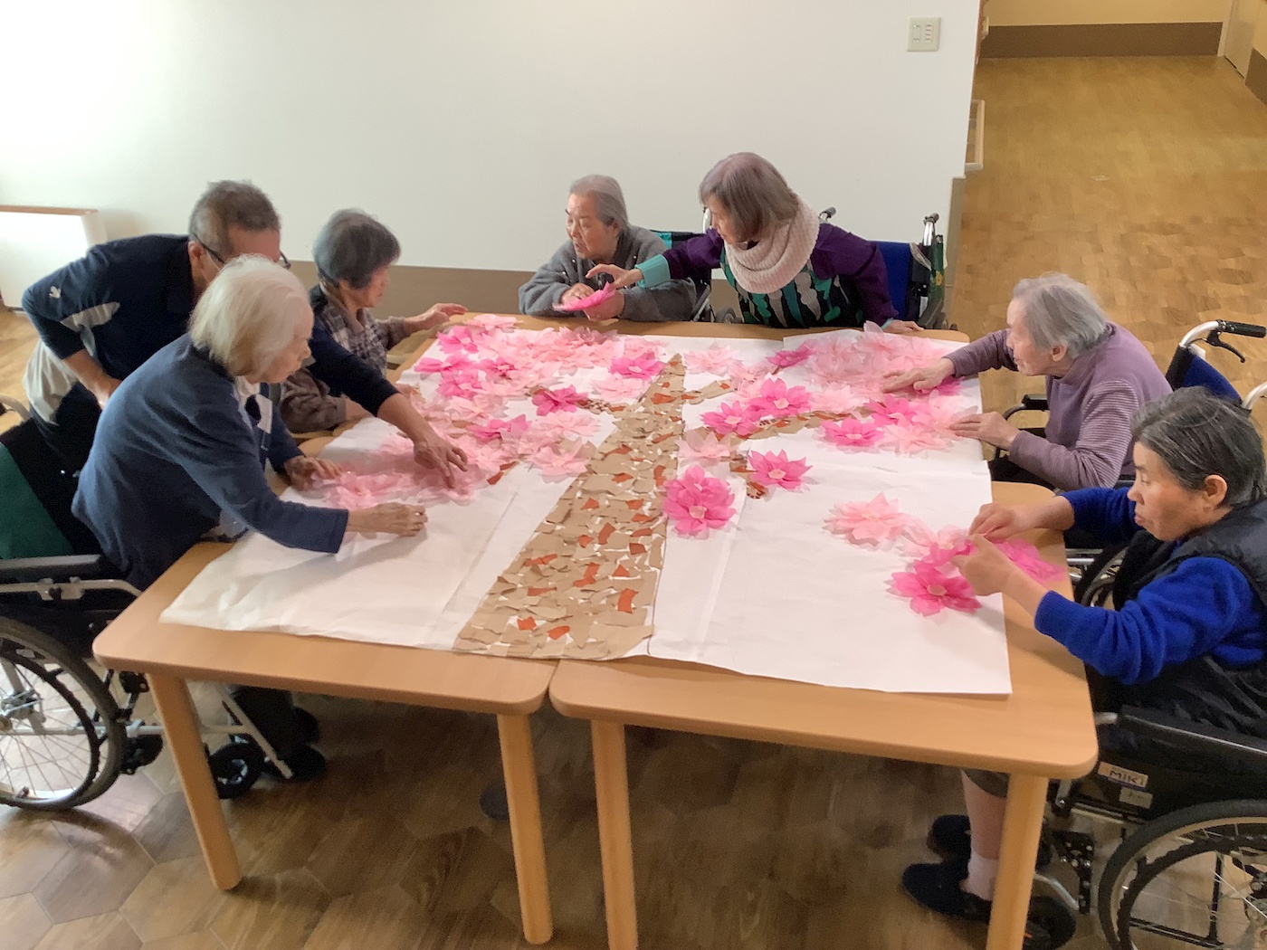 特養フィーカのユニットにみんなで桜の花を咲かせました。先ずは桜の花を作ろう。