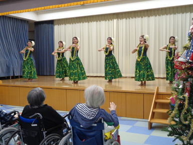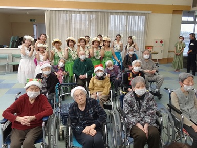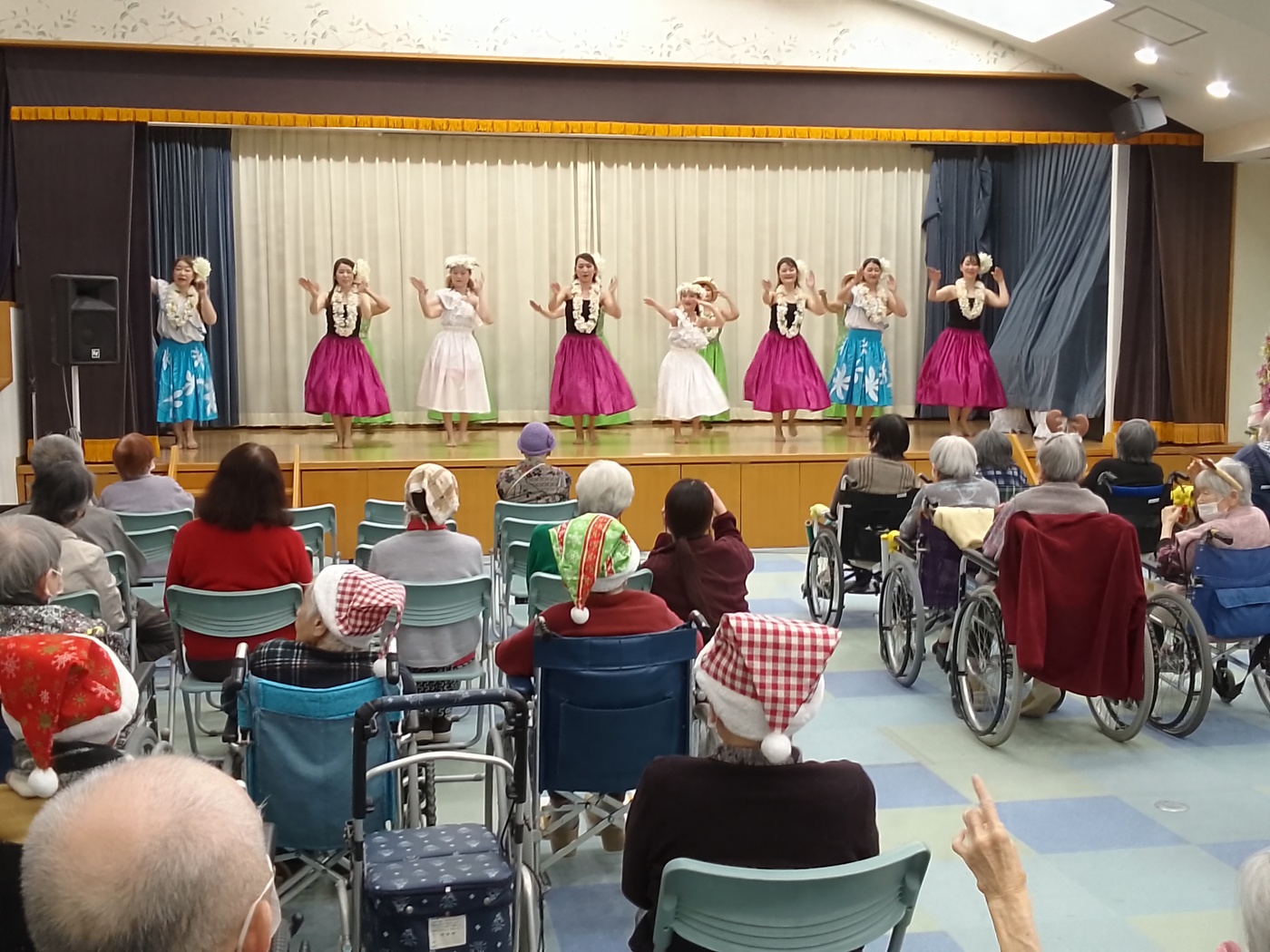 寒さが一段と厳しくなり、冬の訪れを感じる季節になりました。そんな中おりいぶ荘に心あたたまるひとときを届けてくださったのが、フラダンス(^^♪ アロハ・オハナの皆さまです。色鮮やかな衣装に思わず…「可愛い~」と声が(*’▽’)南国の風を感じさせる優雅な踊りに、利用者様も自然と笑顔になり一緒に身体を動かされたりとても楽しい時間を過ごされました。