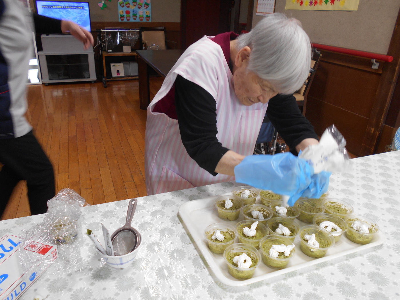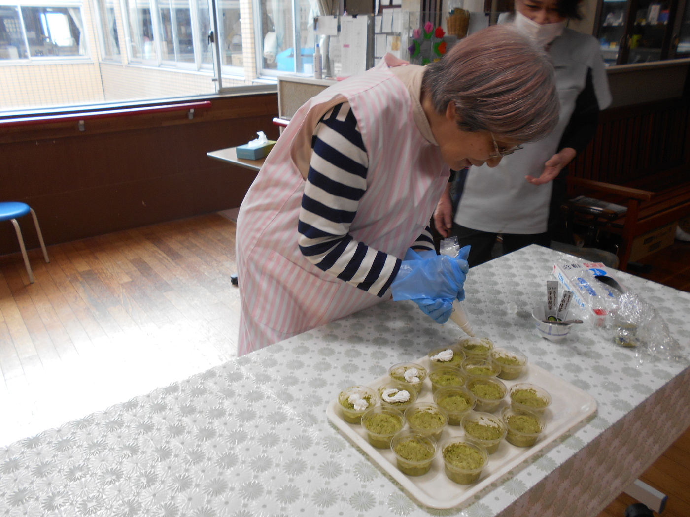 11月おやつレク「抹茶チョコレートムース」(花もめん) 2025年11月26日 抹茶とホワイトチョコレートを使ってムース作りをしました。 職員が作ったムースにホイップクリームと抹茶でデコレーションをしていただきました。「これでええん?」「綺麗に出来んわ」等と楽しそうに話しながらホイップクリームを絞って下さいました。出来上がったムースを「これ、美味しい」「甘いわ」と言いながら召し上がって下さいました。 Tweet