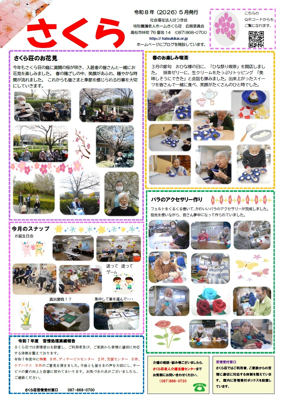 令和8年 広報誌 令和8年5月号[1,189KB] 【記事】 ・さくら荘のお花見 ・春のお楽しみ喫茶 ・バラのアクセサリー作り ・今月のスナップ(お誕生日会など) 令和8年3月号[950KB] 【記事】 ・福祉避難所初期対応訓練 ・AI野々村真&シンプソンズマジックショ― ・節分の豆まき ・交通安全教室 令和8年1月号[845KB] 【記事】 ・理事長新年のご挨拶 ・施設長新年のご挨拶 ・ミュージックウェイコンサート ・クリスマス会 ・もちつき