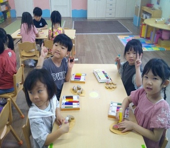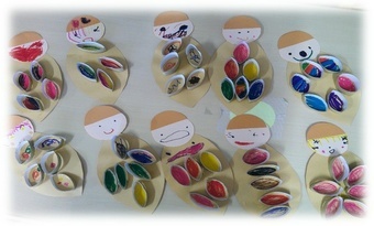 昨日貼ったボンドが固まっていたので、トイレットペーパーの芯の間に色を塗ったりミノムシの顔をかいたりしました。