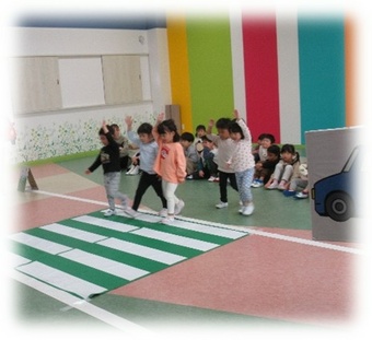 交通安全教室がありました。真剣な表情でお話を聞いて、質問に答えたり横断歩道を渡る