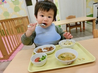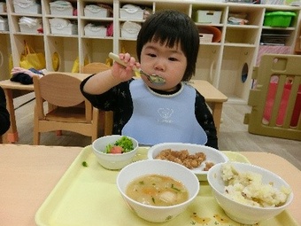 まだお皿に食具を持っていないほうの手を添えることは難しいのか、お皿が動いて食べにくそうにしているので、これからちょっとずつ「手はここに添えるんだよ」と言うことを伝えていきたいと思います!(^^)!