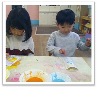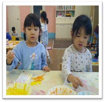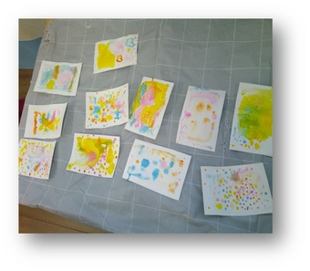 水玉に模様をつけていったり、綿棒で絵を描いたり絵の具が広がっていく面白さを感じたりと