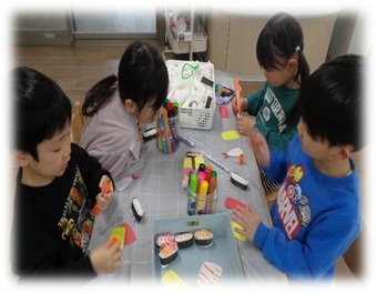 今日はお店屋さんごっこの商品(お寿司)を製作しました。