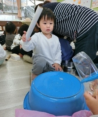 いろいろな物を楽器に見立てて準備してくれていました!!叩いたり、振ったりして