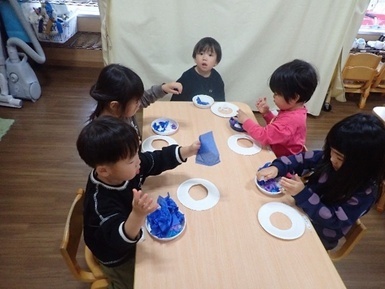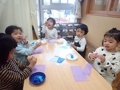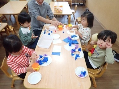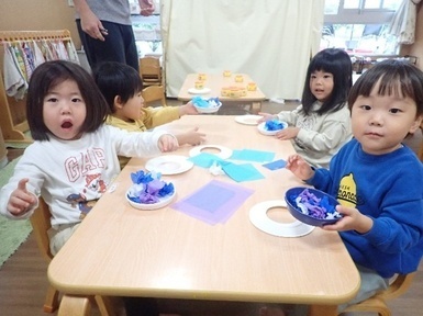 今日は雪だるまの製作をしました( *´艸`)花紙をちぎったり丸めた後は指でのりをつけペタペタと貼ることを楽しんでいました( *´艸`)「たのしいねえ」と友だち同士で共有し合う姿も見られましたよ(#^^#)製作後は園庭に出て各々好きな遊びをしながら体を動かしていました!