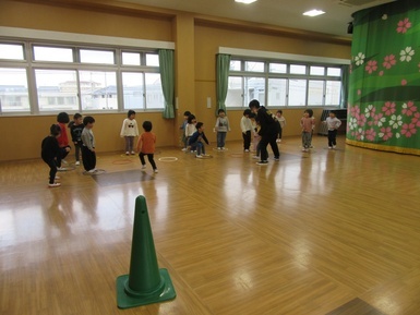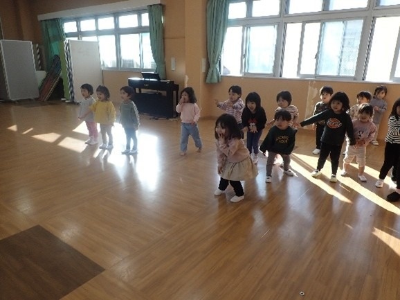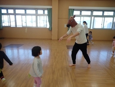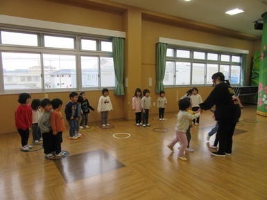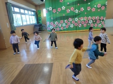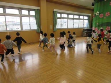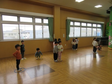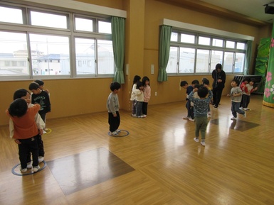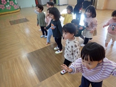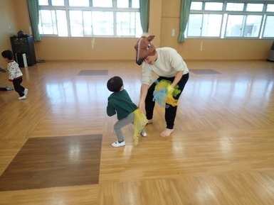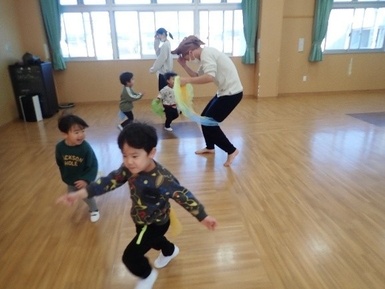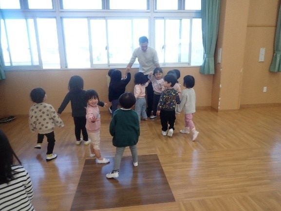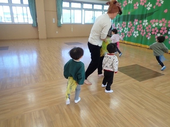 ルールをすぐに理解し、保育者の「おおかみがきたぞ~!」の声で家に見立てたラバーフープに素早く逃げていた子どもたち。徐々にラバーフープの数を減らしたり、掛け声を変えてみたりすると「こっちはいれるよ!」「○○ちゃんおいでよ!」と友だちに声を掛けたり、保育者が「おやつがたべたいなあ~」と言った時には「はいどうぞ!」とおやつをくれる素振りを見せてくれたりと優しい一面が見られていました(*'▽')