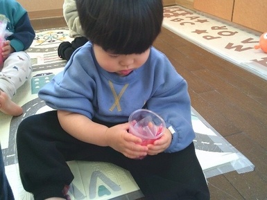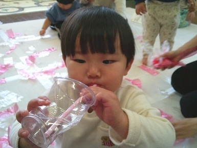 コップとストローを使ってジュース屋さんになりきる姿も!「じゅーすどうぞ!」「おいしい~」とお友だちと顔を見合わせて笑い合う微笑ましい姿も見られましたよ( ´艸`)♡