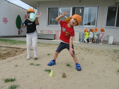 今日はホールで運動会の練習をした後、園庭で遊びました。