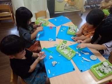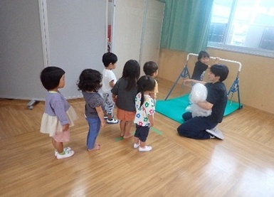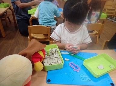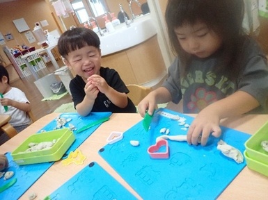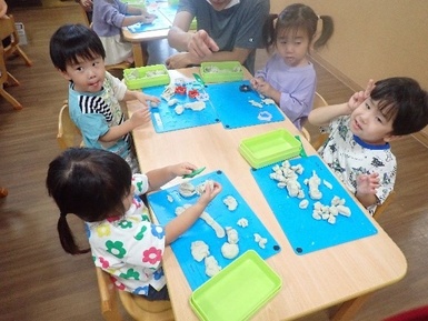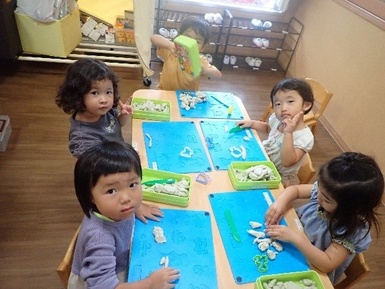 今日は雨が降っていたので粘土遊びをした後、ホールに行って遊びました(*^-^*)粘土を丸めてダンゴを作ったり、ハートや星などのいろいろな型抜きを使いながら楽しんでいました( *´艸`)ホールでは乗用玩具に乗ってホールを駆け抜けたり、ボールを転がして追いかけたりしながら伸び伸びと遊んでいる様子がありましたよ(^^♪