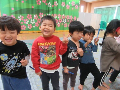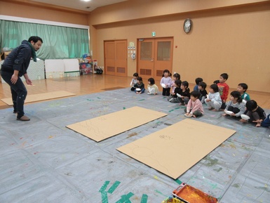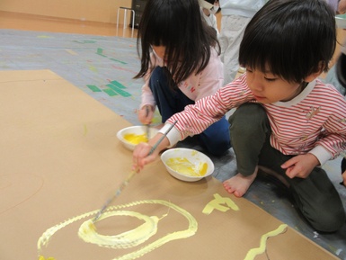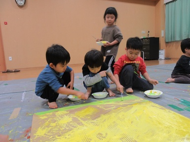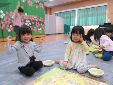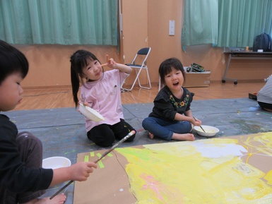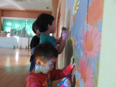 スクリーンに映し出された花をペンでなぞった後は絵の具で塗っていきました。筆やローラー、スポンジ等様々な画材を使って塗り進めており、取り組む中でも「○○くんこっちでいっしょにぬろう!」「○○ちゃんはなんのやくするん?」と友だちと会話を楽しみながら取り組んでいました( *´艸`)