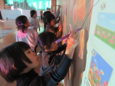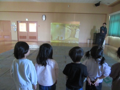 ホールに向かうと“どうぞのいす”のページが大きく映し出されており、子どもたちはびっくり!
