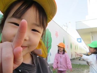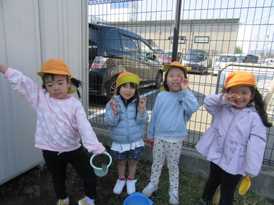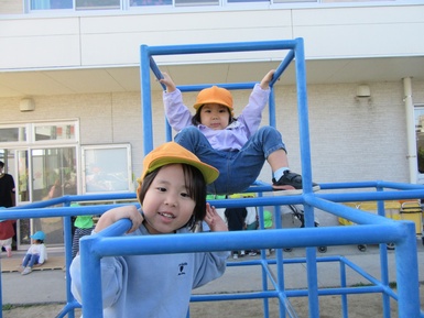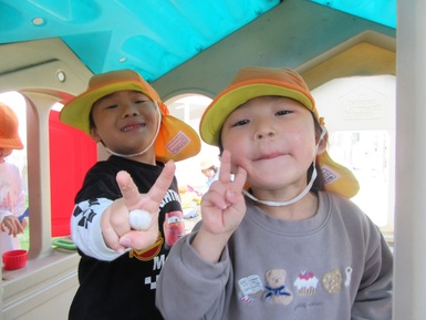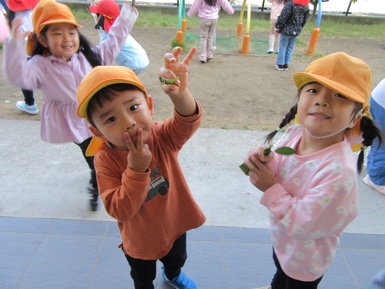 楽器あそびでは、保育者の合図をよく聞いて取り組もうとする姿が見られ、園庭あそびでは、バッタを見付けると嬉しそうに「せんせいバッタみつけた~!」と教えてくれたり砂場でごっこ遊びを楽しんだりしている姿がありました( *´艸`)