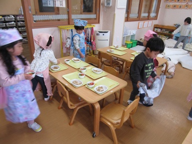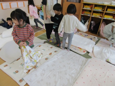 「おとうばんたのしい」「ごはんはこっちよね?」と給食の置き方を見ながら楽しんでお手伝いをしてくれています( ^)o(^ )給食当番ではないグループの子どもたちは布団を並べるのを手伝ってくれています(*^。^*)