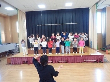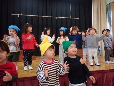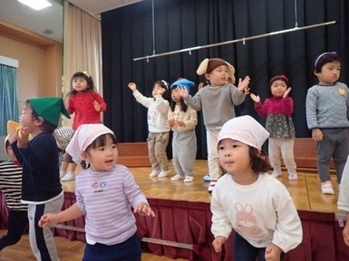 ホールでの劇ごっこでは、手あそびや歌、セリフ、ダンスにも意欲的に取り組み、一人ひとりが生き生きと表現する姿に成長を感じました(*^^)v