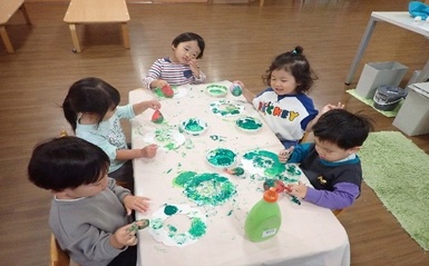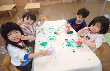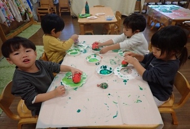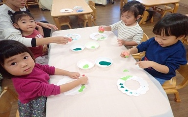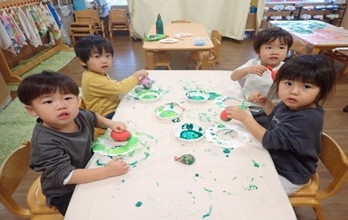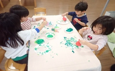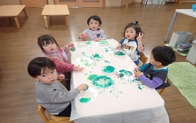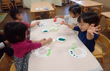 今日は風船スタンプを使ってクリスマスリースの製作をしました( *´艸`)風船を手で持ち、ペタペタとスタンプする事に夢中になって楽しんでいました(#^^#)「たのしいね~」と友だち同士で共有し合う姿も見られましたよ(#^^#)