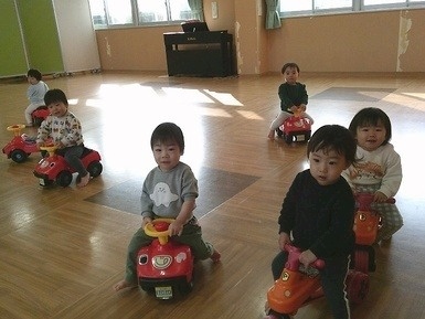ホールあそびでは、すっかり乗用玩具に乗ることが上手になり、お友だちとの並走を