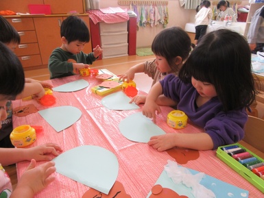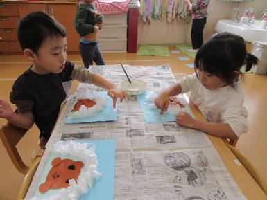 「ねむってるかおがいい!」「ういんくにしようかなあ」と思い思いの顔を描いた後はのりで貼っていきました。のりを塗る際、縁取るように塗っていくよう伝えると意識しながら塗り進めていました( *´艸`)