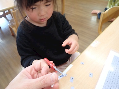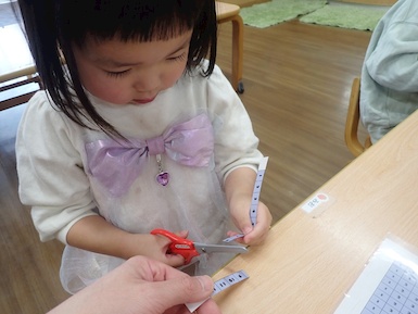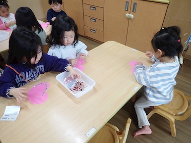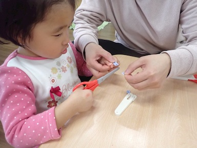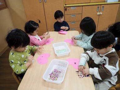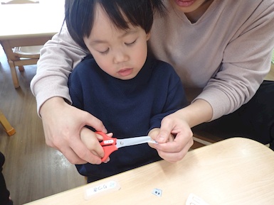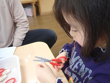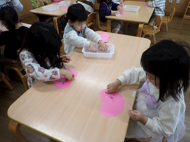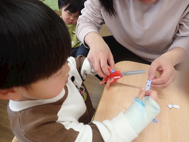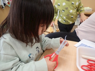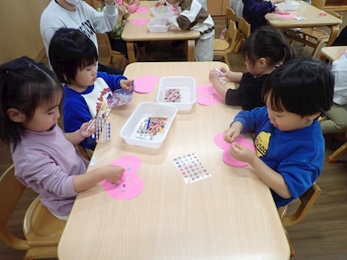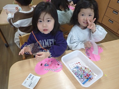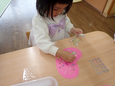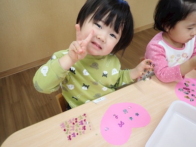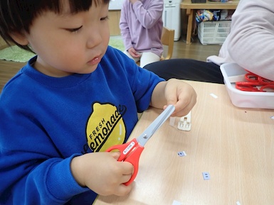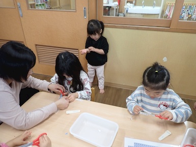 今日はお店屋さんごっこに向けて、ペンダント時計の製作をしました( *´艸`)ハート型の画用紙に好きなシールをデコレーション!「キラキラ可愛い!」と夢中で貼っていました( *´艸`)そして、すみれ組さん初めてのハサミに挑戦✂使い方を聞きながら、ドキドキの表情で時計の数字をチョッキン!「パッチン!」と切れた瞬間、「できた!」と満面の笑顔が弾けました。小さな職人たちの真剣な眼差しと成功の喜びがとても微笑ましかったです☆彡