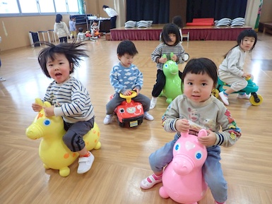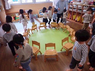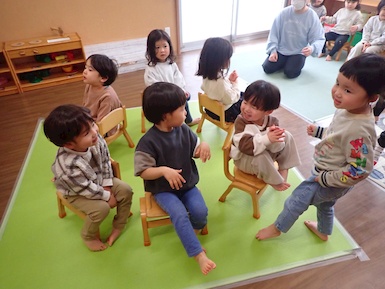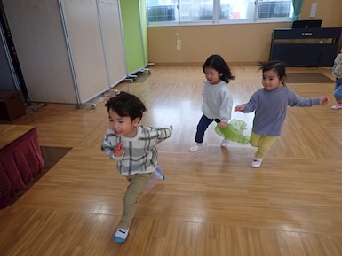 今日は椅子取りゲームに挑戦!「負けても泣かないよ」「友だちは押さない」の約束もしっかり守り、楽しめました★その後はホールでしっぽとりゲーム!女の子vs男の子チームで白熱した戦いに(^^)/上手にしっぽをキャッチしていましたよ。