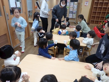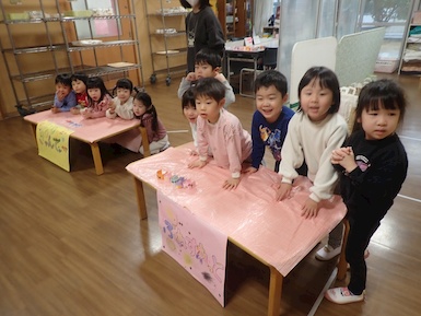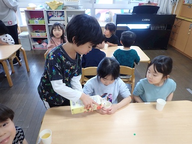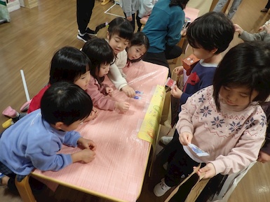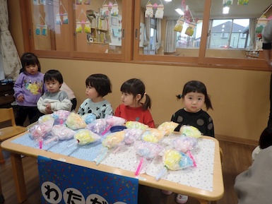 今日はみんなが楽しみにしていたお店屋さんごっこがありました★色んなお店を回りながら「どれにしようかな」と迷いながらも嬉しそうに選んでいました(^^)/買い物が終わると友だち同士で「これかったよ!」と見せ合いながら楽しむ様子も見られました☆ 最後はひまわり組さんが配ってくれたリンゴジュースを各クラスのみんなで飲みましたよ❤