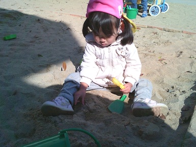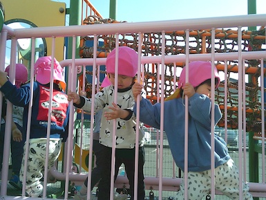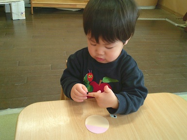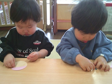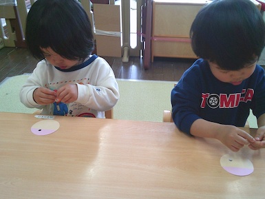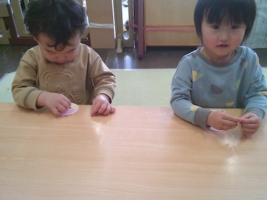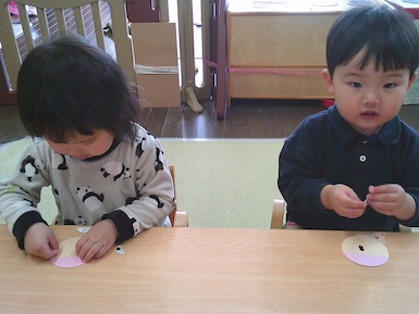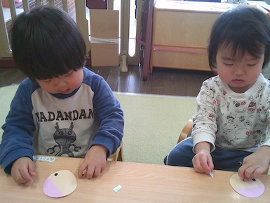 今日はシール貼り遊びをしました。 ちょうちょの顔をシールで可愛く表現!真剣な表情で台紙からシールを剥がしていて、顔が完成すると「できた~!」と嬉しそうに見せてくれました♪その後は園庭で遊びました。お城の遊具では滑り台を滑り終わると「もっかいする!」と繰り返し楽しむ姿が見られましたよ(^▽^)/