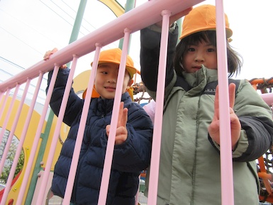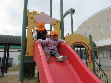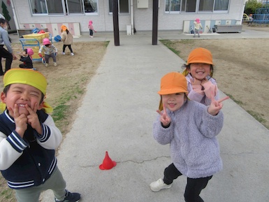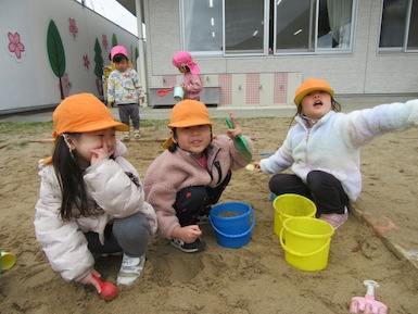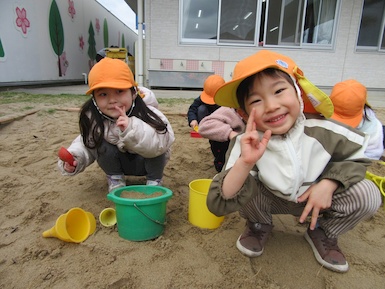 今日は園庭で遊びました。「かくれんぼしよう!」「○○ちゃんがおにね!」と友だちと一緒に仲良く遊ぶ姿がありました(^^)/砂場では昨日の雨で砂が湿っていたのでバケツにいっぱい入れてケーキを作ってお祝いする姿もありました(*^-^*)