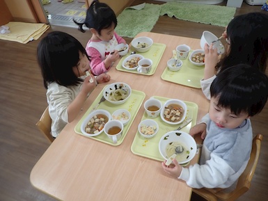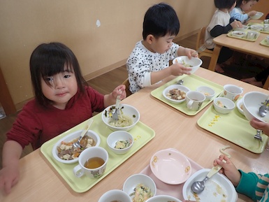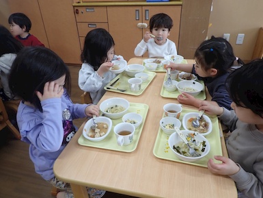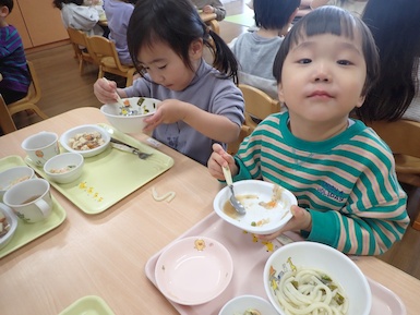 今日は園庭あそびを満喫しました★ジャングルジムやたいこ雲梯に果敢に挑戦したり、滑り台や追いかけっこで走り回ったり、砂場でじっくり遊んだりと、それぞれお気に入りの遊びを楽しんでいましたよ(*^-^*)そして今日は久しぶりにすみれさん全員集合♬たくさん遊んだ後の昼食のうどんは格別だったようでもりもり美味しそうに食べていました