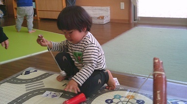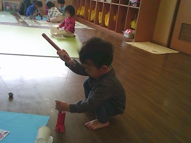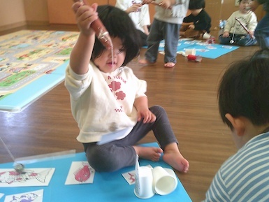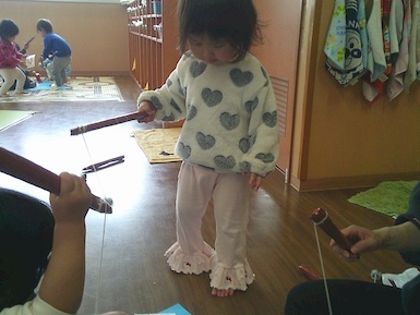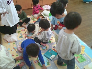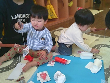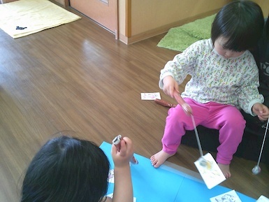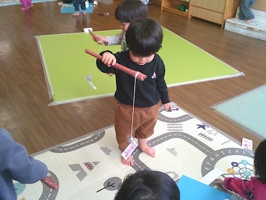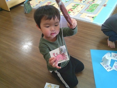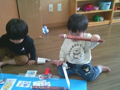 今日は室内で魚釣り遊びをしました。準備していると「それおさかな?」「やりたい!」と興味津々な子ども達!釣り竿を上手く動かして魚を持ち上げると「みて、とれた!」と嬉しそうに見せてくれました(*^▽^*)また、今日はみんなですみれ組へお引っ越し!新しいお部屋やおもちゃ、絵本を見て「わぁ~!」と目が輝いていましたよ♪もうすぐすみれ組さん、楽しみだね(^▽^)/