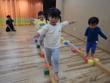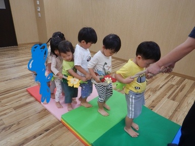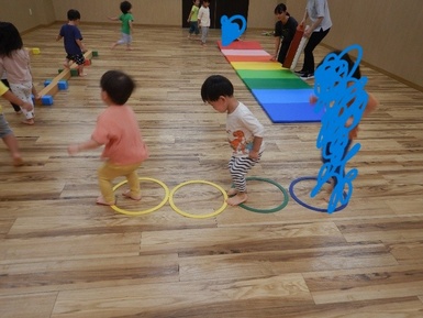 また、ホールではマットやミニハードルを使って様々な道に見立てて遊びました☆