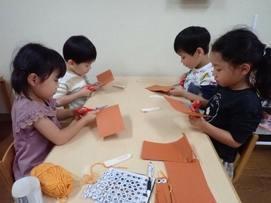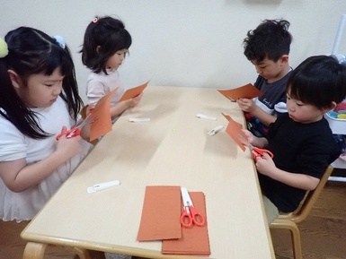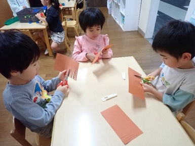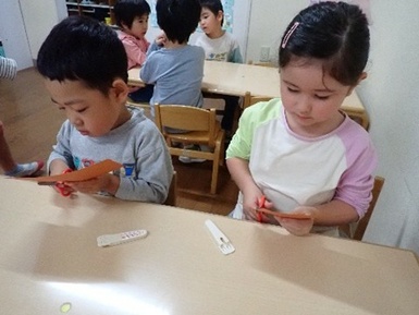 画用紙に書かれた線に沿って、ハサミで切っていきますよ!