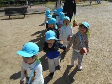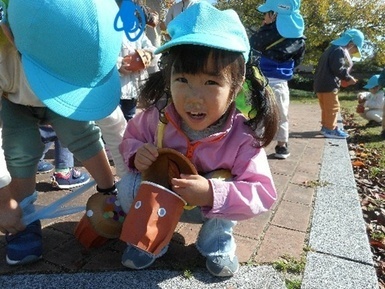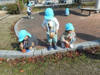 「これ、みて~」と見せてくれながら入れたり、落ち葉だけでなく、石や砂を入れている子どももいました(笑)