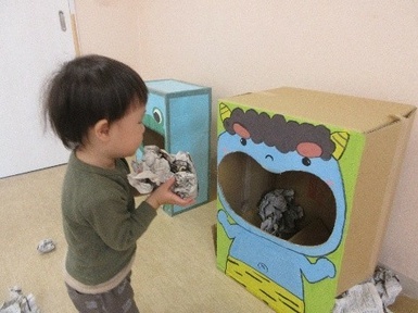今日は室内でボールプールやトンネル、新聞を使って遊びました!