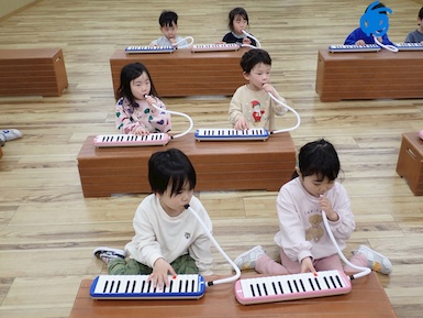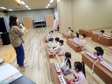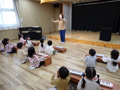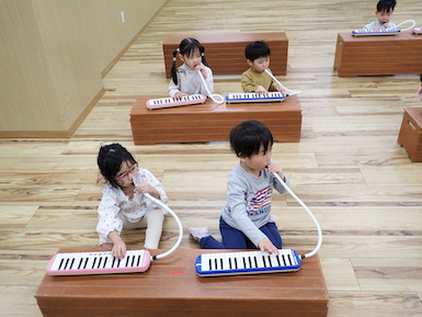 初めて鍵盤ハーモニカを使っての音楽教室でした☆初めにみんなで”ドレミファソラシド”を手を使って表現しました。