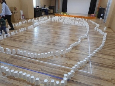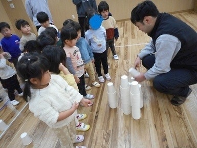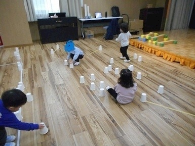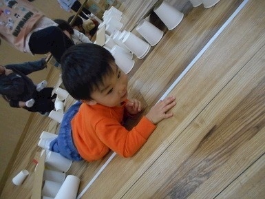 紙コップを使ってみんなで道を作ったり、紙コップの上に段ボールを置いて橋を作って通ってみたりして遊びましたよ!