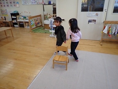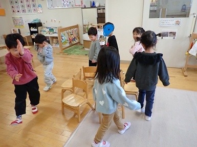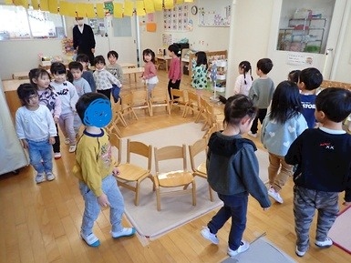 ルールを覚えている子どもも多く、「おんがくがおわったら、すわるんだよ」など友だち同士で伝え合っていました。