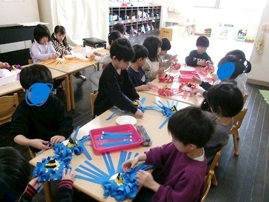 鬼の髪の毛をくるくるとねじって貼ることに苦戦する姿もありましたが、