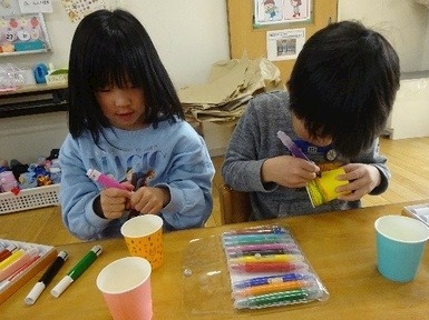 2個目の商品としてけん玉を作りました。紙コップに描くイラストのテーマを決めてから描き進めました。