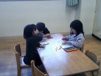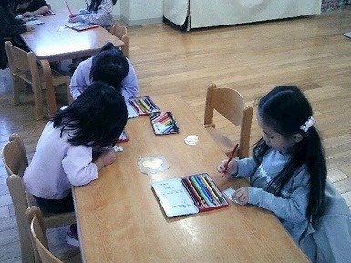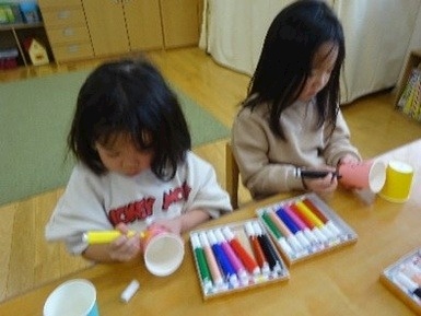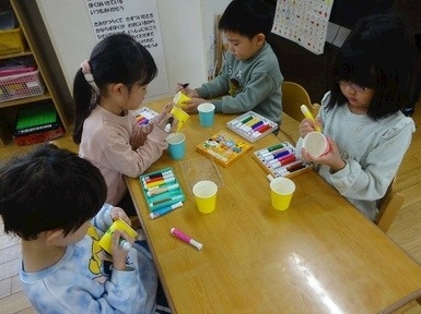 リレー遊び後は、お部屋でお店屋さんごっこの看板作りを行いました。