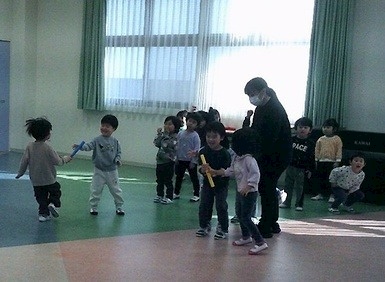 リレー遊びでは、全員でリレーの練習をした後、2チームに分かれて競い合いました。大きな声で「頑張るぞー!!」と話し、盛り上がりました☺