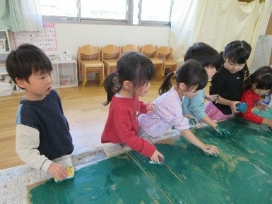 緑色チームと白色チームに分かれてスポンジを使って段ボールに塗り色をつけました。