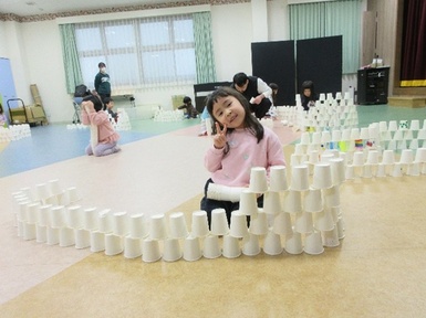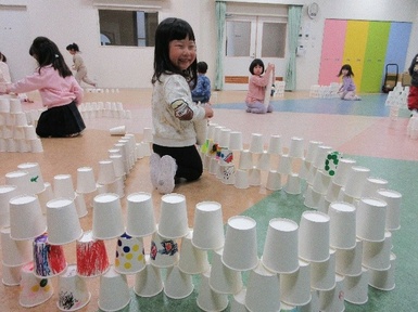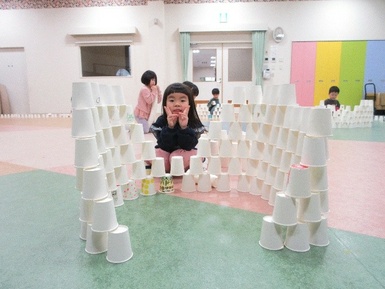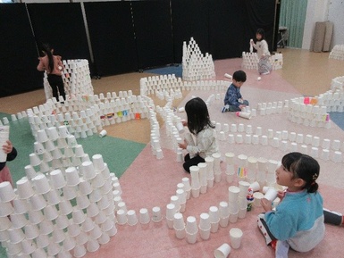 10個の紙コップでどこまで高く積み上げられるかを競い合ったり、自分だけのお家を作ったのちに道を繋げてお友だちの家の遊びに行ったりしながら創作していた子どもたちです(⌒∇⌒)